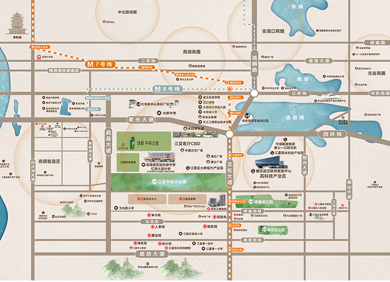 近邻城际铁路,连接三环线、四环线等立体交通;毗邻文化大道、武昌大道等核心大道,距地铁7号线江夏客厅站点约600米。